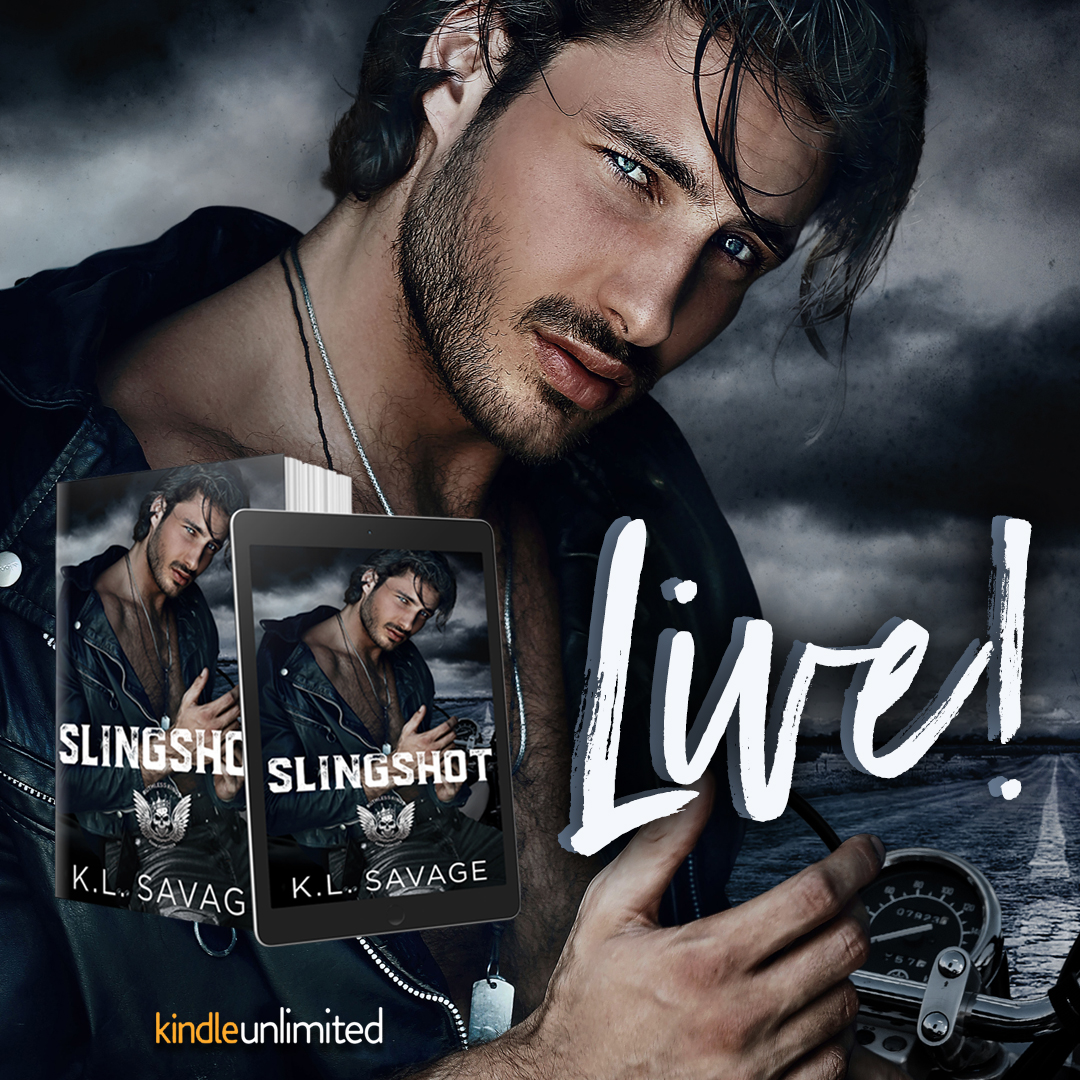 Slingshot comes outside, and he marches to me with powerful strides. The sun glints against his leather cut and his blue eyes; god, they hypnotize me. I don’t think he knows the power he exudes because he’s always holding it in. Without stopping, he wraps his hand around the back of my neck and bends me, dipping me over his knee as he kisses me, stealing my breath as his own.